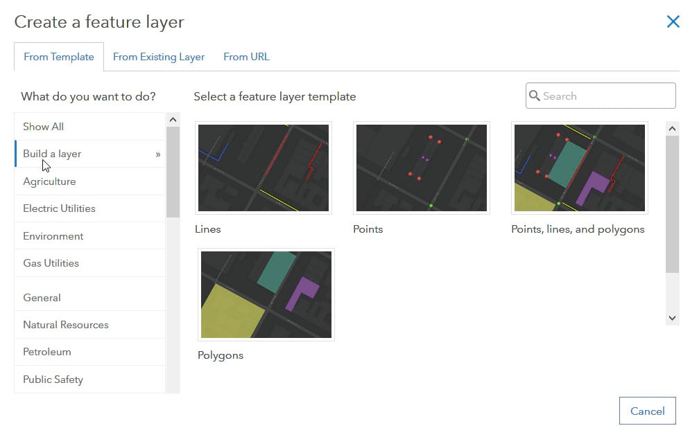 The feature layer template gallery now includes templates that allow you to build empty hosted feature layers and define the layer schema, rather than use predefined schemas. These new templates are in the Build a layer category in the template gallery. Choose a template to create a point, line, or polygon layer, and add fields, define lists or value ranges for the fields, and configure feature types and templates.