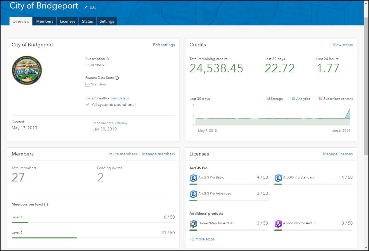 The organization page has been redesigned to help you administer your organization, manage members, and access information quickly. See the status and latest content of your organization at a glance, including description details and credits, and toggle through different views of your organization. Find members quickly to review their items and activity, filter them by role and level, and disable and enable membership for multiple users at once. The new design matches the recently updated design for Content, Groups, and Item pages.