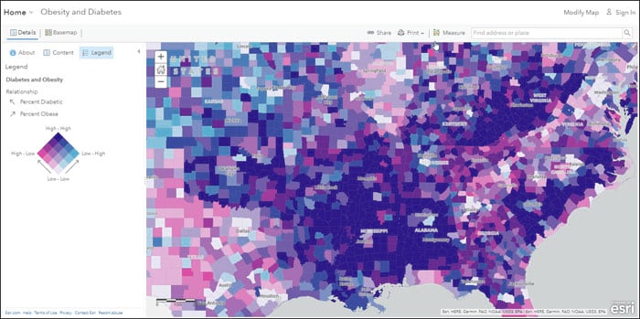 For example, using the Relationship style, you can see in this map where obesity rates and diabetes rates are both high.