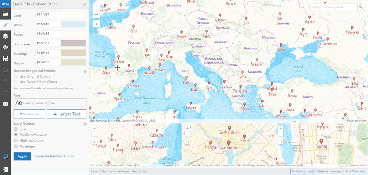 ArcGIS Vector Tile Style Editor makes it easy for you to create custom styles for any of the Esri vector basemaps, and you can also use it on your own vector tile layers. When finished, save your work and use it to create unique and distinctive maps, add them to your organization’s default basemaps, or share your work so others can use them. It’s currently in beta, but you can check it out here. See Design custom basemaps with the ArcGIS vector style editor for more information.