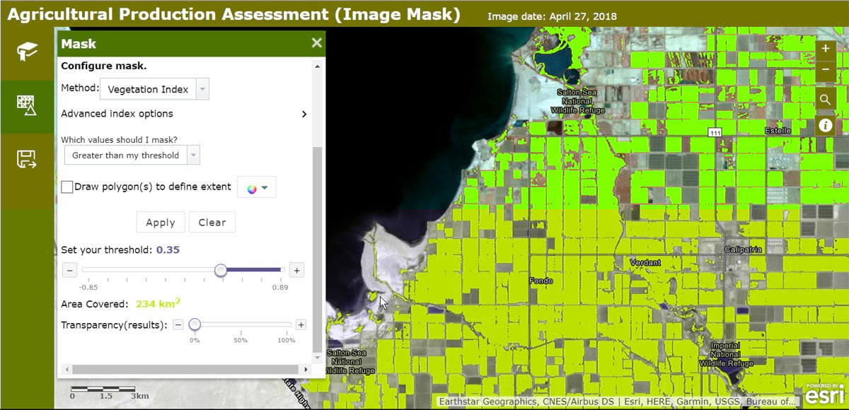 Perhaps you’re looking for an app to identify landslides, or estimate the size of cultivated fields? Image Mask offers interactive analytical tools that let users identify areas of an image that have changed over time, or that meet user-set thresholds for calculated indexes (like NDVI).