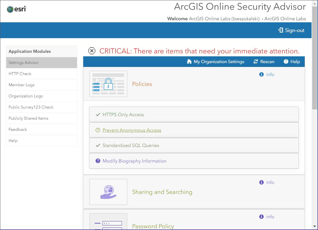 ArcGIS Online Security Advisor provides a full run-down of your organization’s security settings at the click of button, eliminating the need to review settings one-by-one administratively. Security Advisor also delivers recommendations based on your current settings.