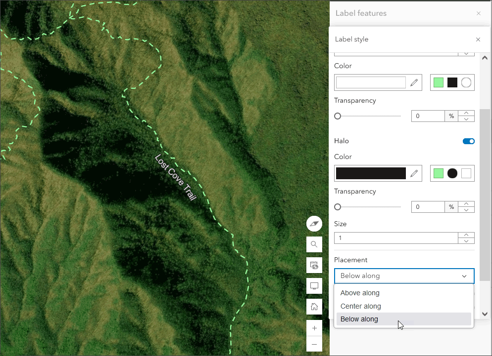 When customizing labels, you can now adjust the position for labels along lines such as streams, roads, or trails, as shown in the image below.