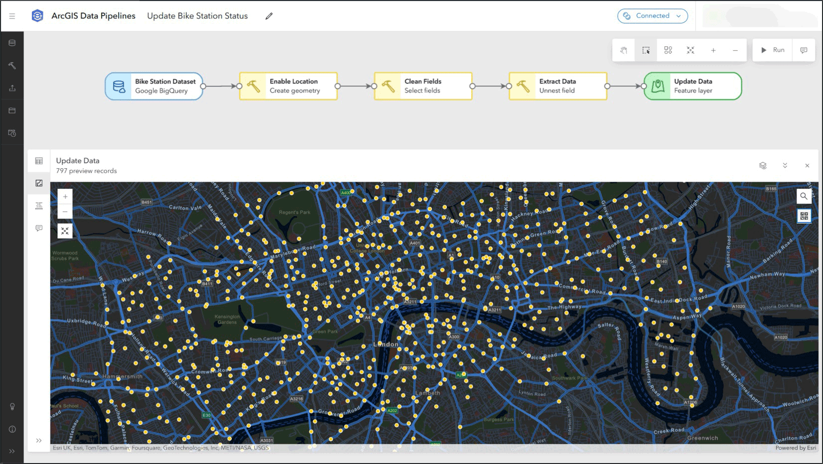 ArcGIS Data Pipelines is a new native data integration capability in ArcGIS Online, offering a drag-and-drop visual diagramming interface for creating data integration workflows. You can connect to data, either from disk or in the cloud, use common engineering tools to easily clean and transform the data, and then write the processed results out to a hosted feature layer, ready for use across the ArcGIS system.