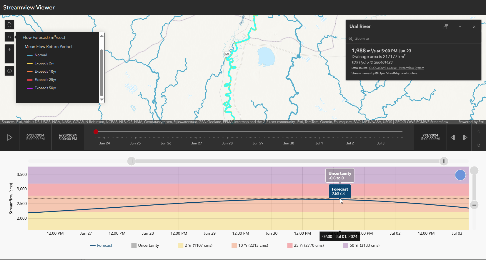 App viewers can interact with a chart showing the return period flow for a specific stream segment and animate changes in the forecast data for each stream segment using the time slider.
