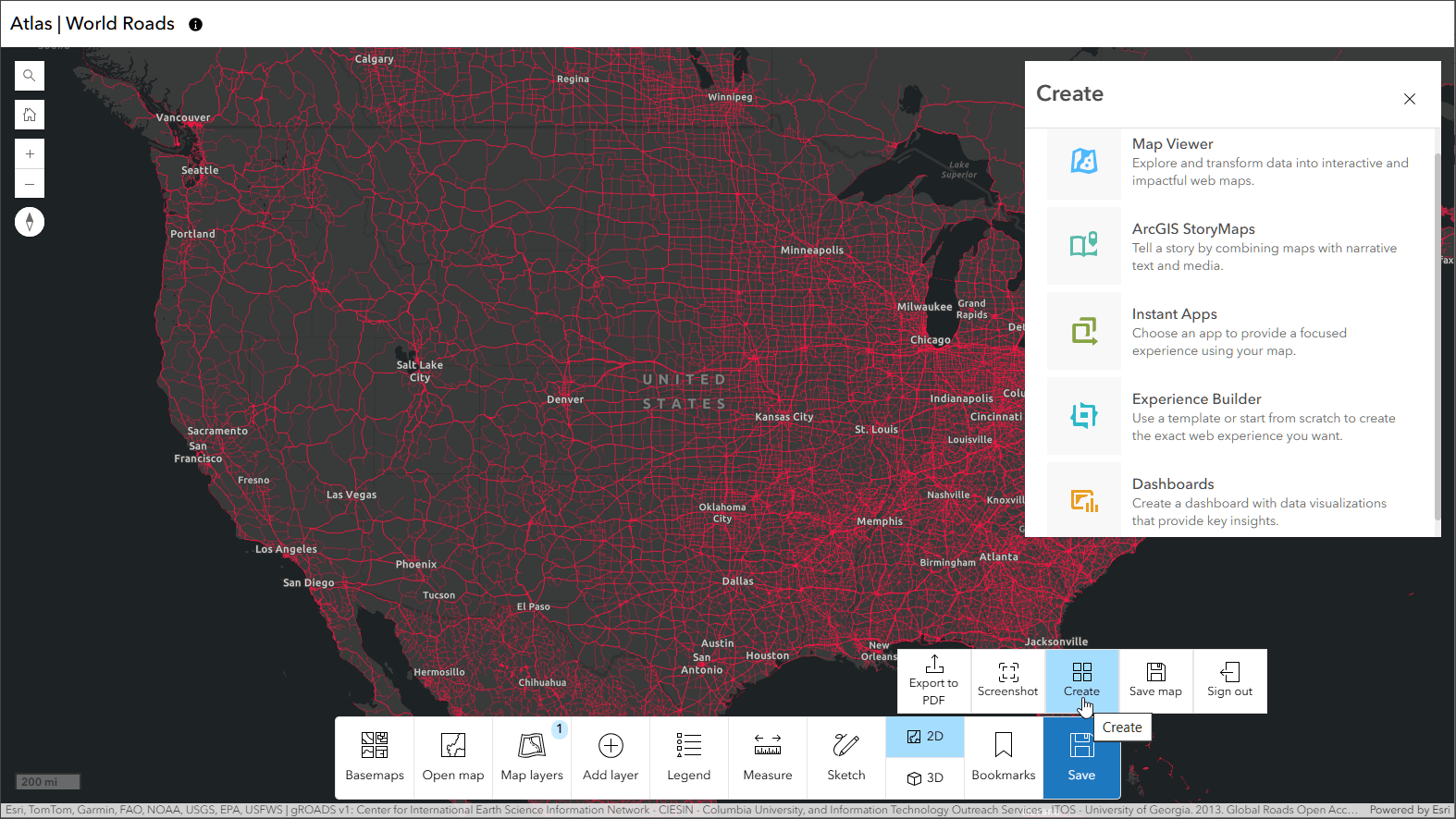 Atlas now supports sketch layers and can be configured with an interactive legend. Atlas can now also be used as a launchpad into other apps, such as other Instant Apps, ArcGIS StoryMaps, or Map Viewer, by configuring a new Create option .