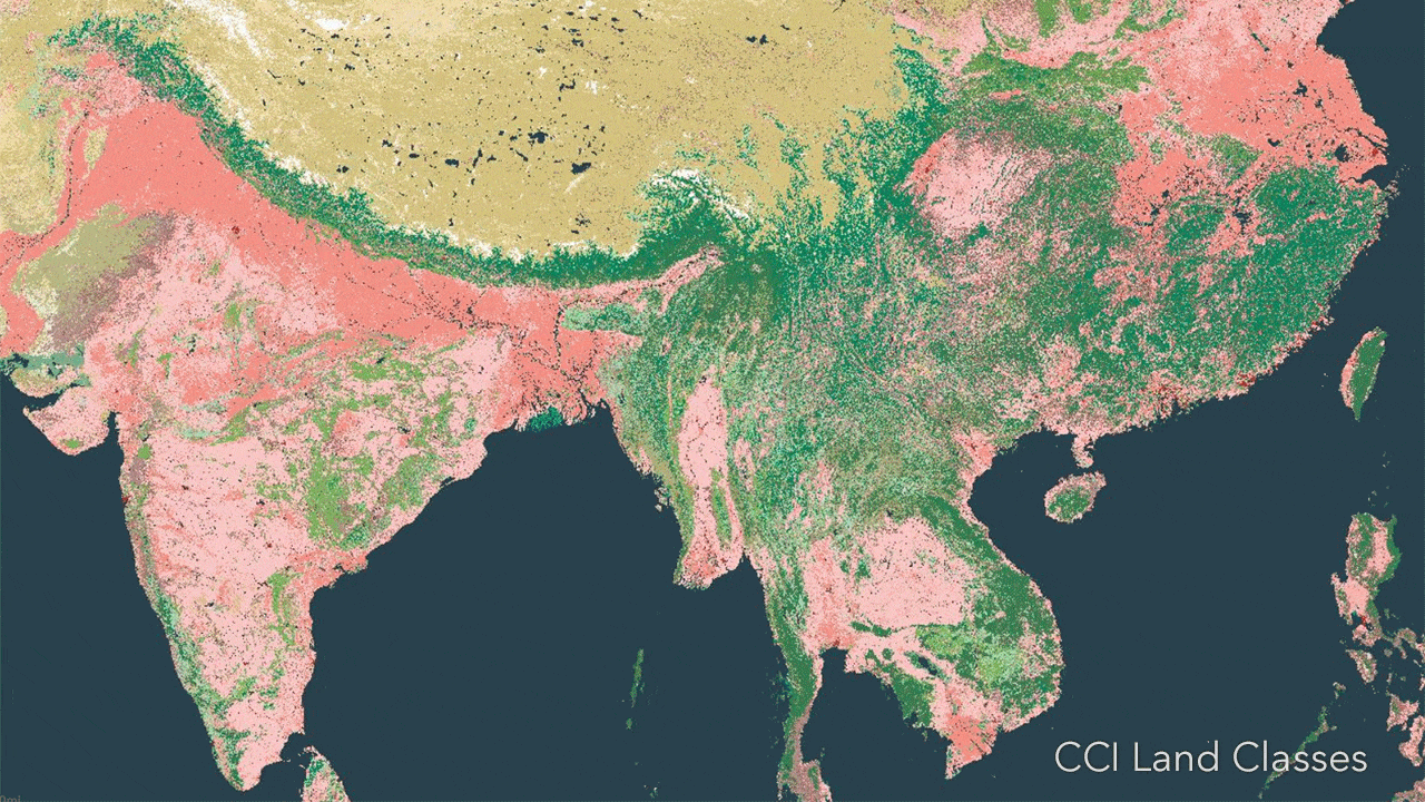 This layer is a time series of the annual ESA CCI land cover maps of the world classified into 36 land cover classes. These classes include agriculture, forests, grasslands, urban, and other categories. ESA has produced land cover maps for the years since 1992 and the layer will display as a time series animation, one year per frame. For more information, see Three decades of global land cover change. For more information, see the item description.