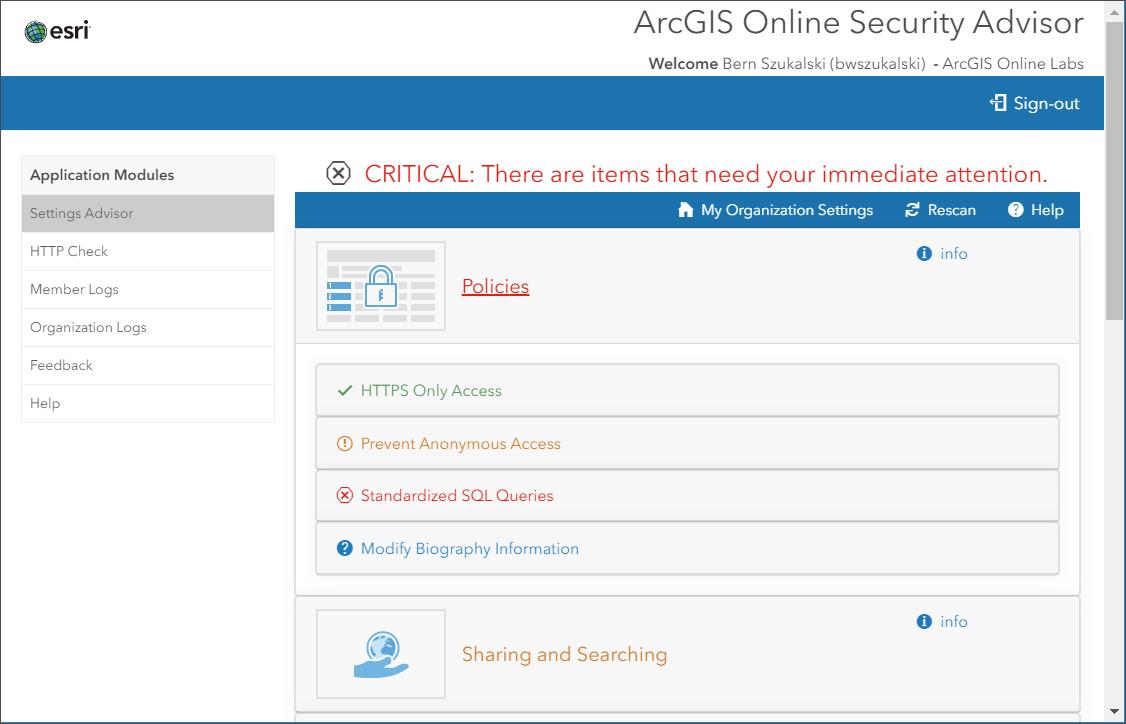 ArcGIS Online Security Advisor provides a full run-down of your organization’s security settings at the click of button, eliminating the need to review settings one-by-one administratively. Security Advisor also delivers recommendations based on your current settings.