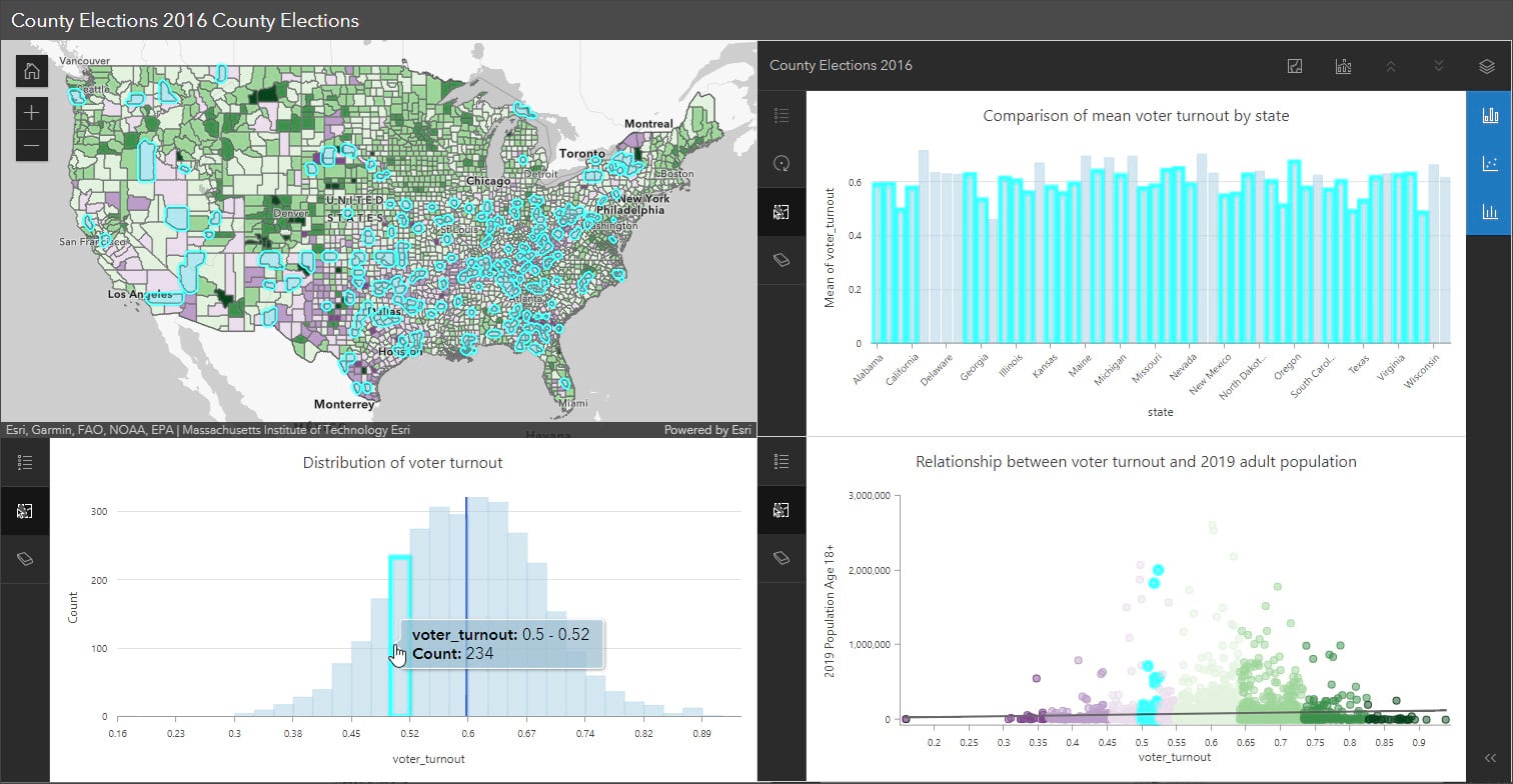 Chart Viewer has been extended to allow for the display of up to three charts at once alongside the map. Chart Viewer is a good choice when you want viewers to explore your map alongside interactive bar charts, histograms, line charts, and scatter plots related to your data.