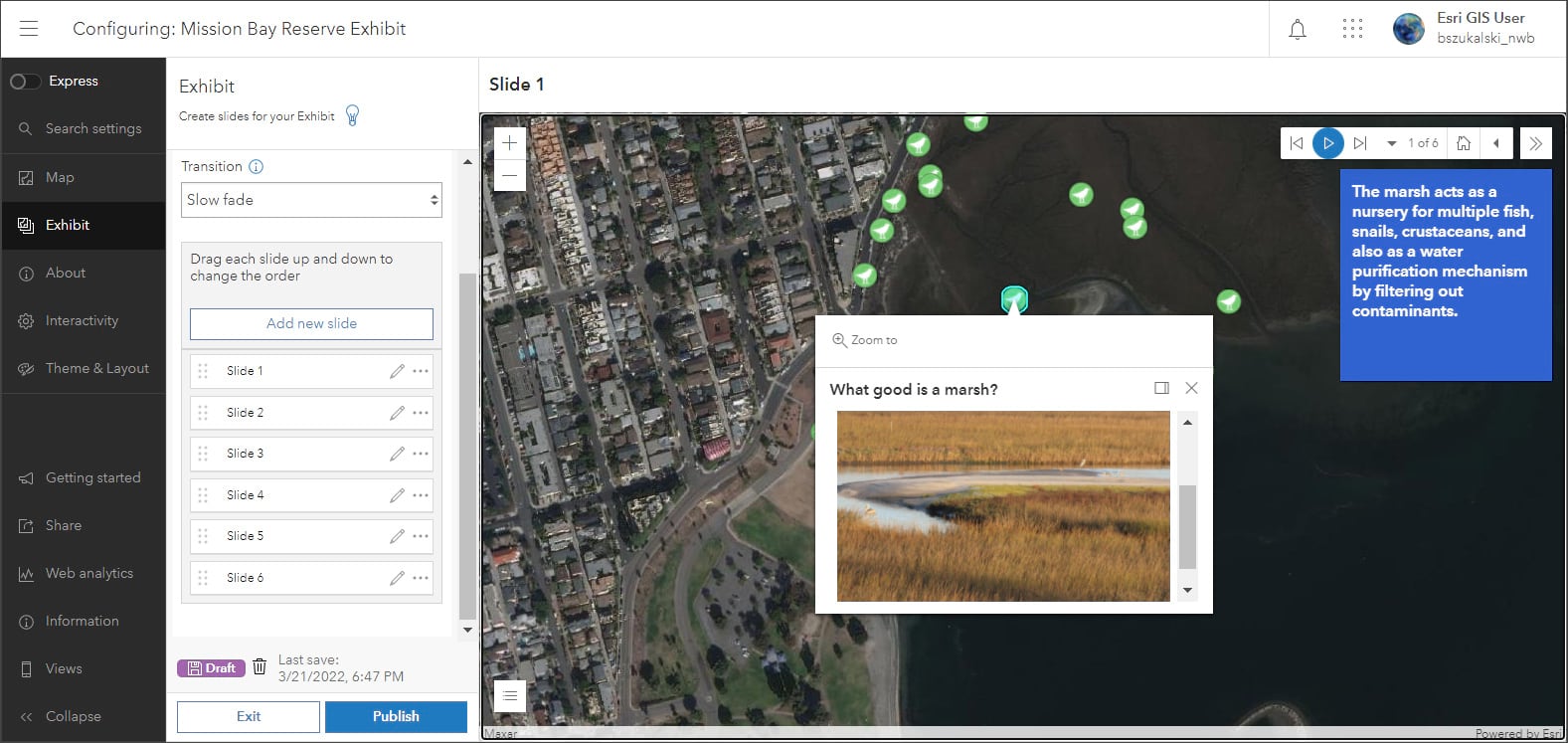 Exhibit is a new Instant App. Introduced in beta with the December 2021 update, it is now fully released. It delivers a sequential presentation that you can use to tell a story using interactive slides with different map extents and other settings.