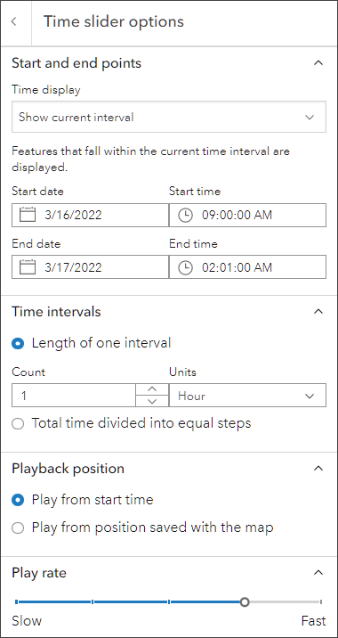 Time slider options can now be accessed from the options menu (…) on the time slider. They can also be accessed from Map Properties.