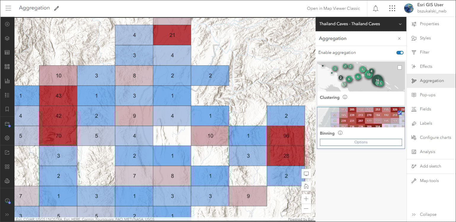 Map Viewer includes new options for summarizing point feature data. The Aggregation button now lets you configure geohash binning to aggregate point features into summary polygons. Bin size, fields, labels, and pop-ups can also be configured.