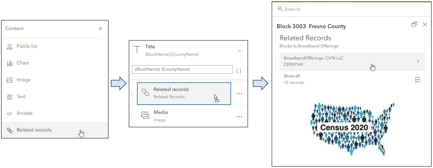To show related records, from the pop-ups pane click Add content, then choose Related records. The related records appear along with other content blocks you may configure. The example below shows a Related records block with a 1-M relationship along with an Image block.