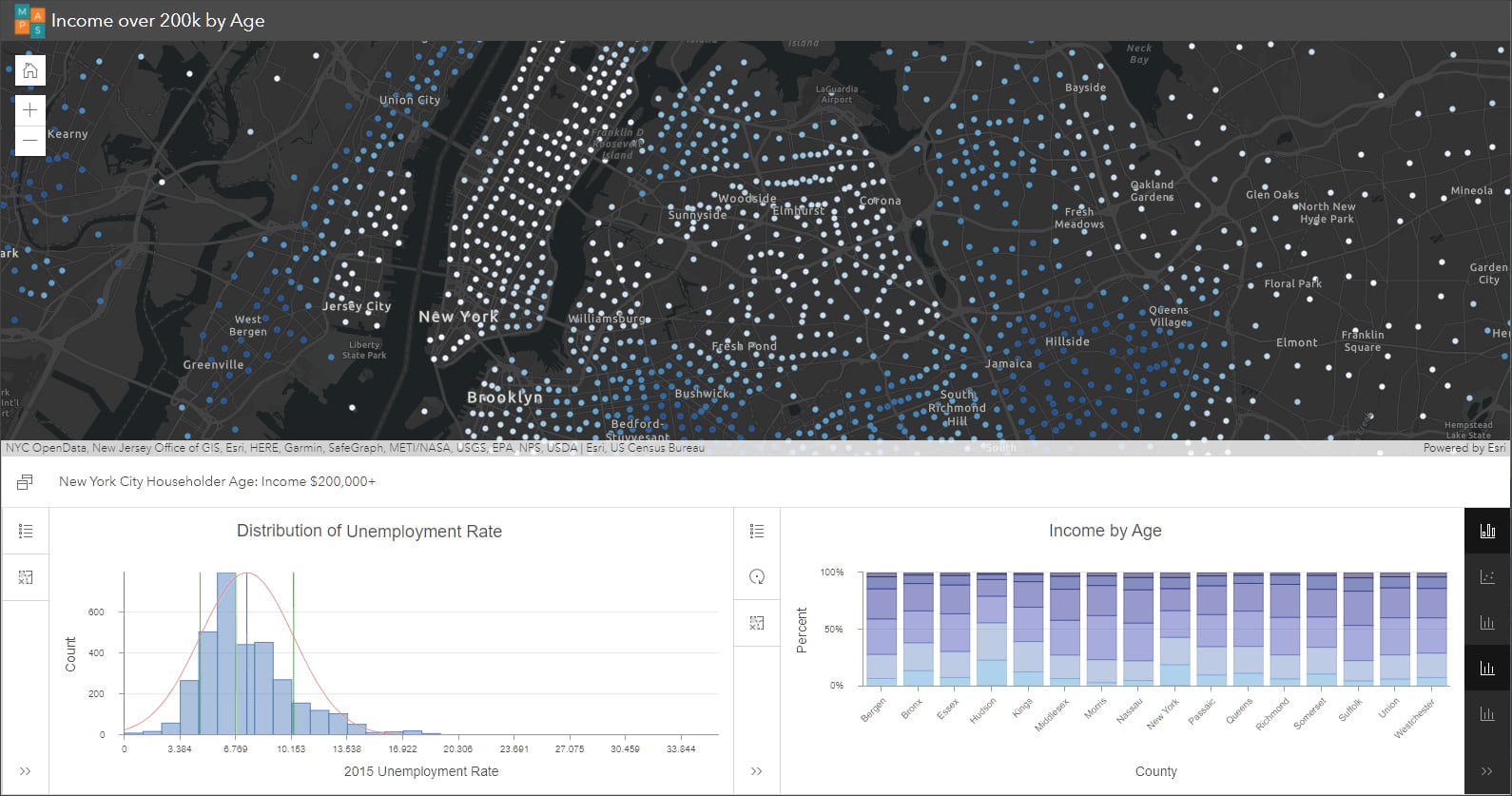 Chart Viewer (beta) allows app viewers to explore your map beside bar charts, histograms, line charts, and scatter plots related to your data. App authors can display multiple data-based graphics configured in Map Viewer to complement information in the map. Up to ten charts can be included in the app and each can be viewed alongside your map or side by side with other charts for comparison.