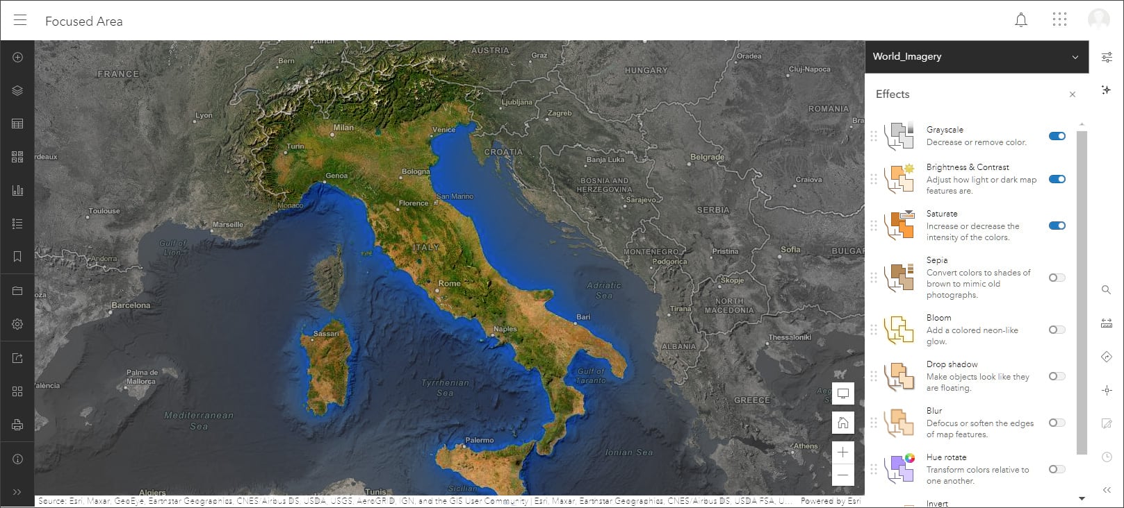 For more information, see Use effects, Layer effects in Map Viewer and Enhancing imagery basemaps with layer effects.