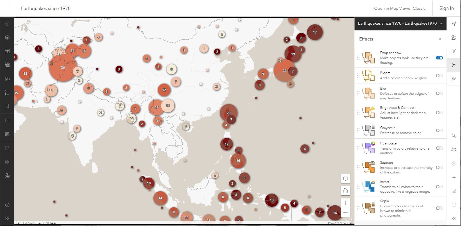 Using effects, you can enhance your maps using creative visualizations. For example, you can apply a bloom effect to point features to highlight them or make the labels on a map stand out by applying a drop shadow effect. Effects can be applied to basemaps and operational layers.