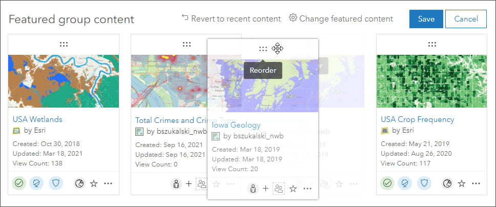Once added, featured content can be reordered by grabbing the item card, then dragging and dropping it into a new position.
