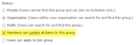 Administrators can create groups that allow members of the group to update items shared with that group. This is useful for shift workers in operations centers who need to update maps used in their apps and dashboards, and for other situations where multiple people need to update the same item.