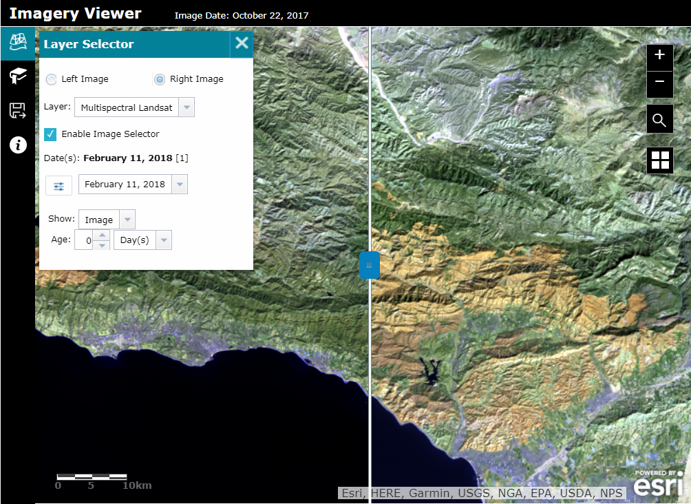 Visualize and explore imagery through time and space with the Imagery Viewer (beta). This app includes tools for navigating through time, recording locations, measurement, and more. Non-imagery layers are supported as well as editable feature layers for annotation. Imagery Viewer supports both a one-image configuration for focusing on a single imagery layer, as well as a two-image configuration that lets users compare two imagery layers using a swipe tool. Image measurement is supported for imagery layers that have mensuration capabilities.