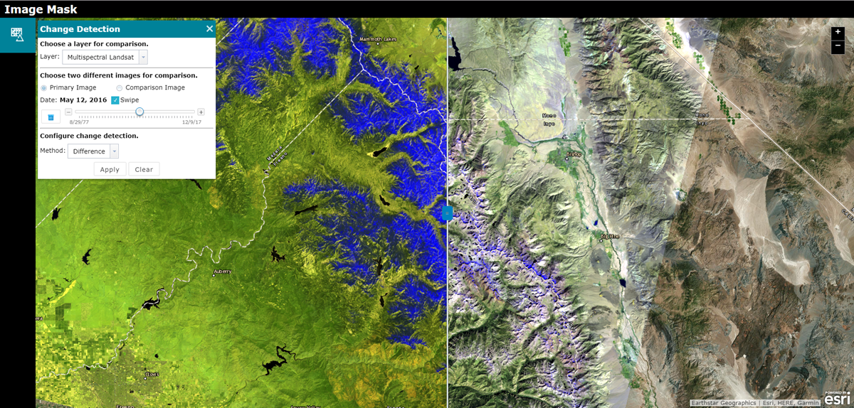 Calculate, visualize, and mask change between two images using the new Image Mask (beta). Select specific images from a layer to visualize using a time slider or dropdown menu of attributes. A variety of change detection methods are available for producing results. This app also includes a few tools such as measurement and the ability to export an imagery layer to the local machine or to a layer in the user’s ArcGIS Online account.