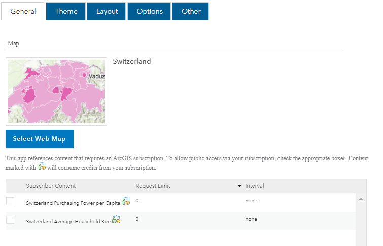 Map Styler offers the ability to easily design and style apps with Calcite colors, themes, and layouts with generous out-of-the-box control. New with this update we have added support for publicly sharing maps with subscriber content. In the configuration panel of the app on the General tab, any content within the map that requires a subscription will be listed with the option to share it publicly. Take advantage of this functionality if you are going to be sharing your app to the public and want your subscription content to be accessible. Otherwise, do not share the app publicly or remove the subscription content from the map.