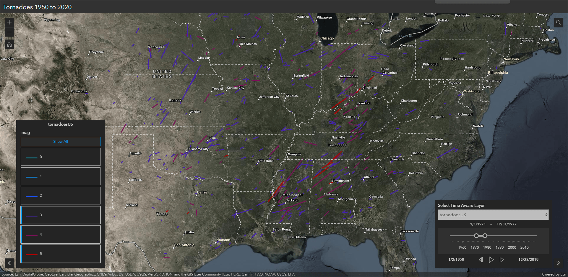 Interactive Legend allows users to visualize features on a map by interacting directly with legend elements to select different classifications of features. This release introduces the ability to filter features using time-enabled layers. Use the time slider in the app to visualize features that occur within a specific time range, and then use the legend to further filter the data based on the selected criteria. For example, if you were analyzing historical tornado tracks across the US, you could use the time slider to show just tornadoes that occurred in the 1970s and then use the legend to filter by tornadoes with a magnitude of 3 or greater.