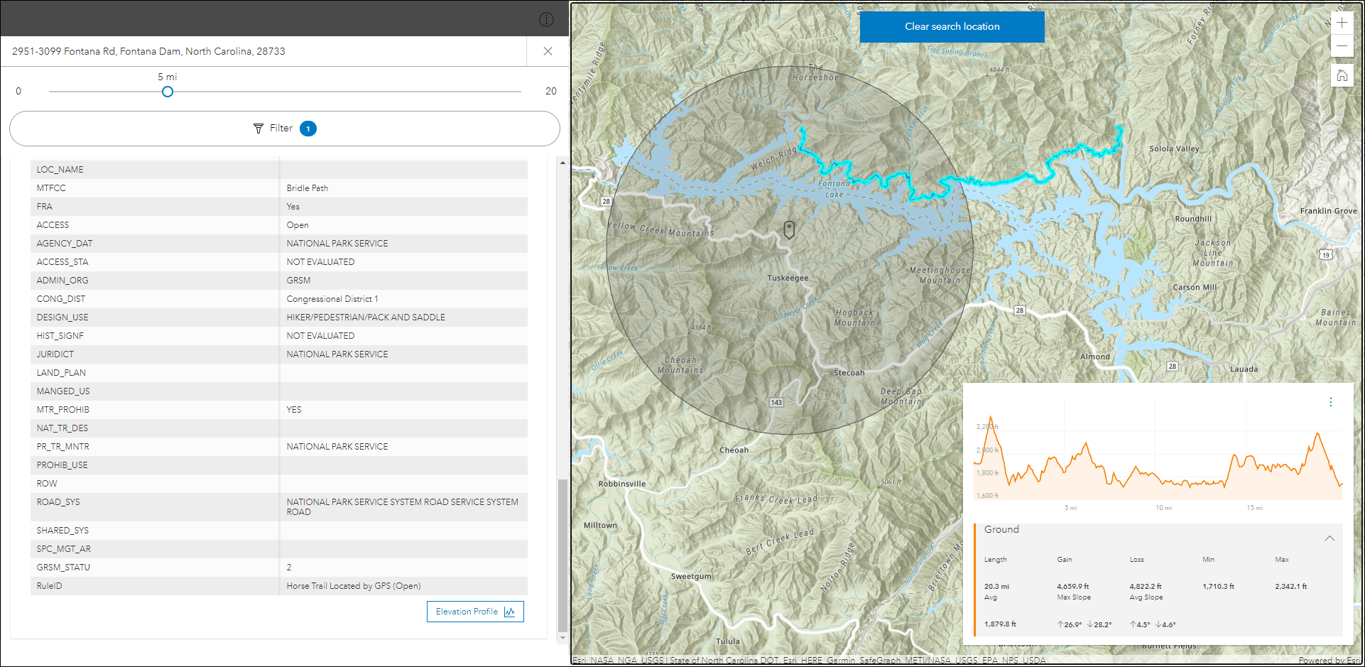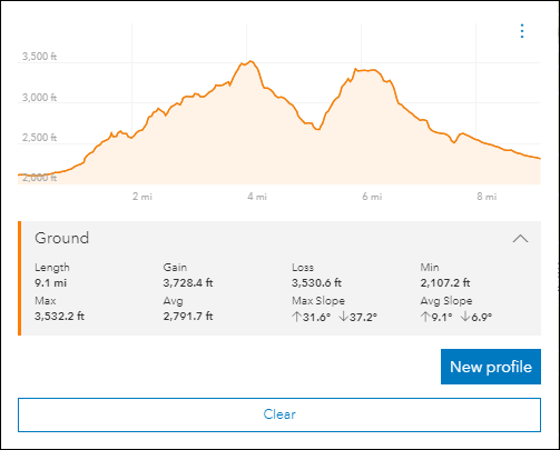 Generate a profile across terrain in a web scene by using this tool in 3D Viewer. Use Nearby to find out what hiking trails are close by, filter the results by length or difficulty (mentioned in an above section), and view the elevation profile for further details.