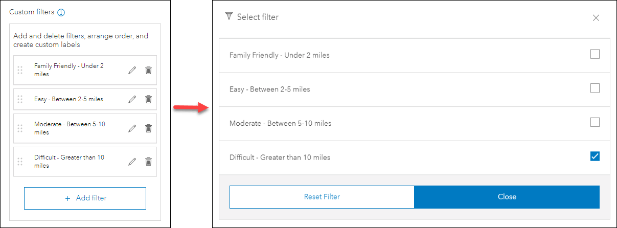 New with this release is the ability to filter results using attributes. For the campground example, after finding which campgrounds are closest by, use attribute filtering to further filter the results to show only campgrounds that are open in May and have running water. The information for the dates of operation and water availability would come from the data layers in the map, and creating the filters would take place in the app configuration on the Interactivity > Filter tab.