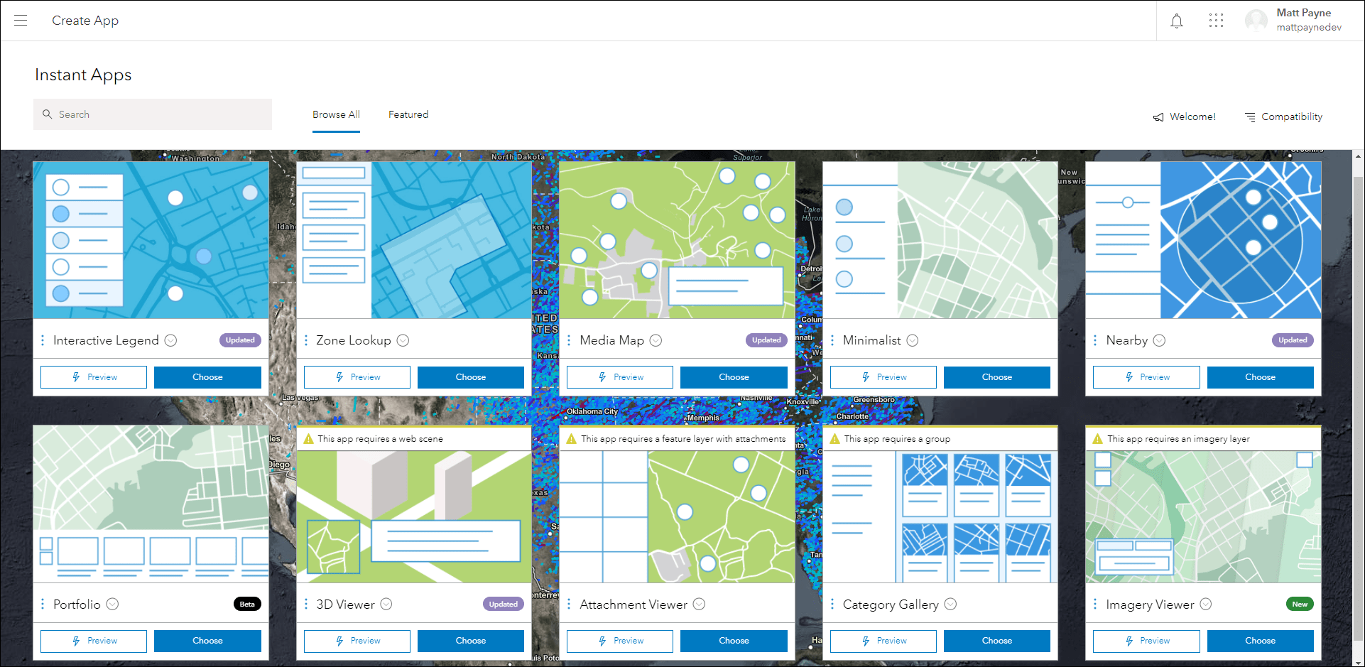 From the new map viewer, click the Create app button in the left side panel and choose Instant Apps to launch the new gallery. Designed to make choosing an app easier and more successful, this new gallery features all of the apps that take advantage of the new app configuration. The apps are initially sorted on the Browse All tab based on compatibility with your web map (shown behind the gallery of app choices). Apps that your map and data are compatible with are sorted first in the gallery. Use Search to search apps by capabilities. For example, search for “bookmarks” and only apps supporting the use of bookmarks will return in the results.