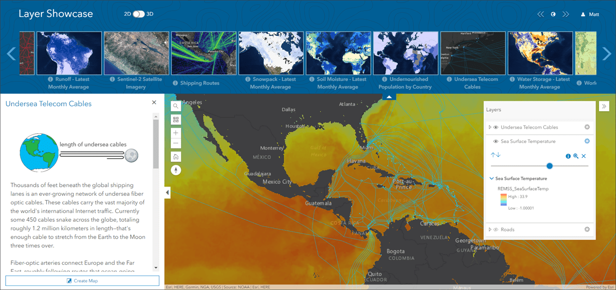 Layer Showcase (beta) allows you to display a gallery of layers from a group. Layers can be added to a map or scene within the app and explored using a layer list and map navigation tools. Optionally, a user can choose to create a new web map or web scene from the layers they have added. The side panel in the app displays the description of the group on load and will also display the description of a layer by clicking the info button. Adding a layer also displays the layer description, and the user has the choice of adding a layer as the only one visible in the map. Layer Showcase (beta) is a simple and interactive way to allow users to browse a group of layer based content and transition them to a web map or web scene.
