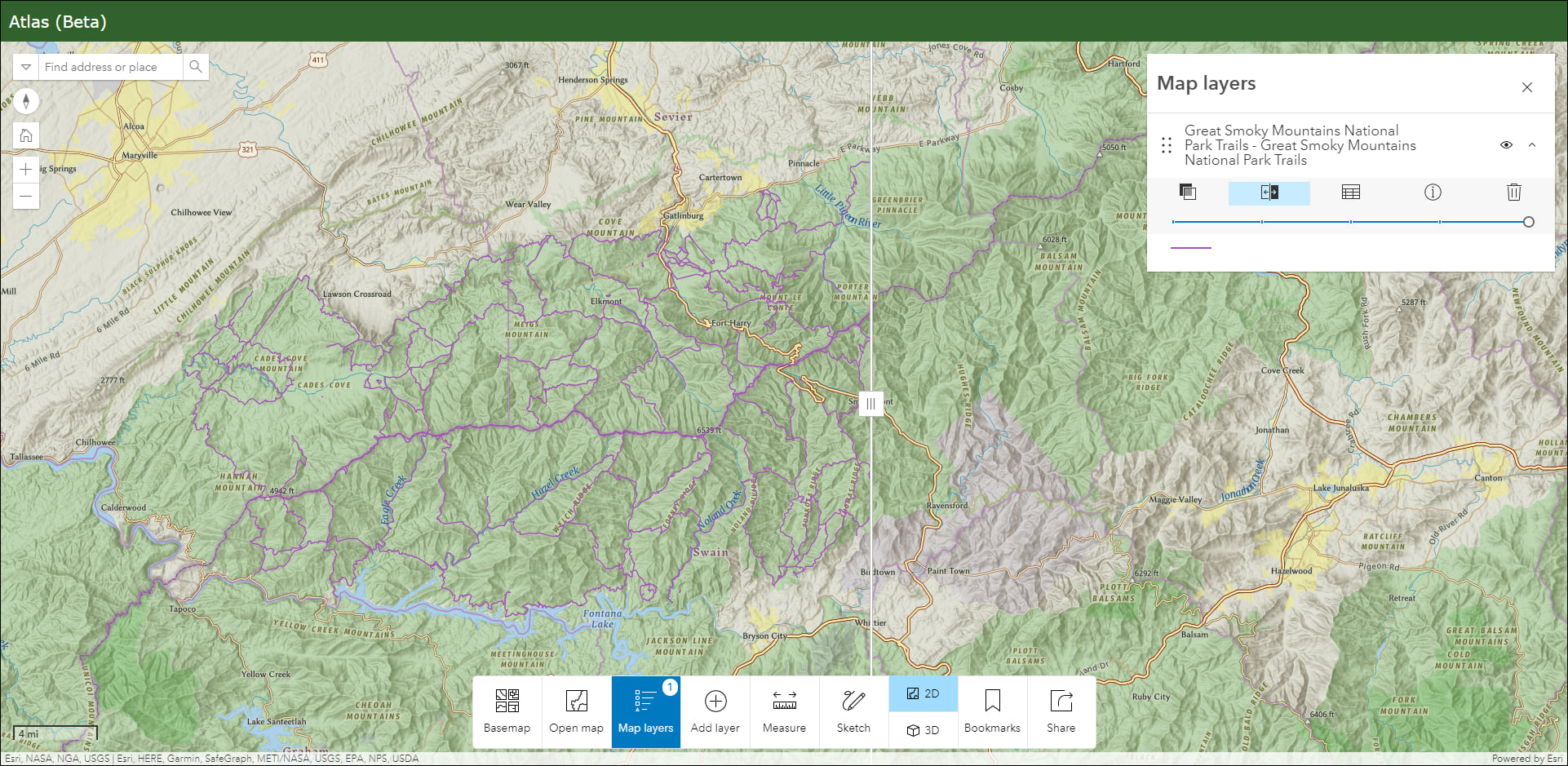 Atlas (Beta) provides viewers with tools to explore layers from a group with light weight mapping and data exploration capabilities. Viewers can open a map and add individual layers to it. They can utilize measurement tools, toggle the view between 2D and 3D, use a swipe tool and adjust transparency on layers, and view data as a table. They can use the Share option to quickly generate a URL to share what they see with others. For example, create an app that uses a group of climate impact data layers that viewers can explore. They can interact with the layers by adding them to the map and then share what they find interesting by supplying a title and copying the URL from the share tool.