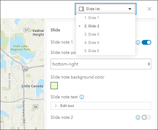 Design an interactive presentation of your map usingĀ Exhibit. Tell a linear story by choosing specific areas of your map to highlight using slides that offer interactivity options such as toggling layer visibility and choosing a unique basemap. When configuring an app created using Exhibit, take advantage of the new inline slide title editing and slide list drop down. Click directly on the slide title to make text edits while you are working on the slide. Use the slide list drop down at the top right to jump directly to any other slide you have created so you can quickly access and make updates where needed.