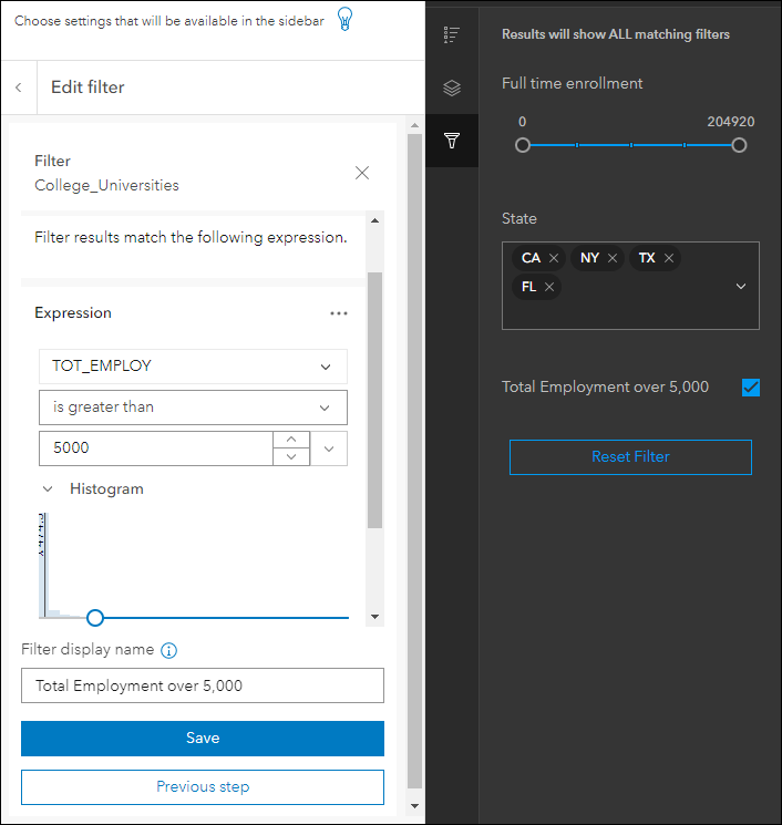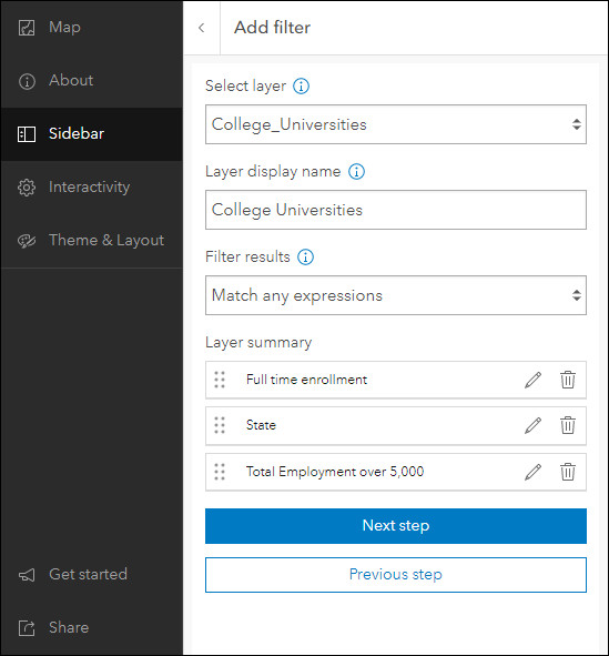 We have improved the design experience of setting up custom filters in Sidebar, Nearby, and Zone Lookup. A filter is a great way to see an important subset of features from a layer without modifying the data itself. The filter can be preset so an app user can toggle it on and off quickly, or it can be set up to accept user input for what to filter the features by. We have redesigned how filters are created in the app configuration for a smooth and more simple experience. Setting up a filter now takes over the space of the configuration side panel and creating filters on multiple layers remains organized in a similar way with the side panel takeover being layer specific. A step through workflow helps ensure each filter you create is successfully carried out to completion. Find the filter setting in the app configuration of Sidebar, Nearby, and Zone Lookup on each app’s respectively named configuration tab.