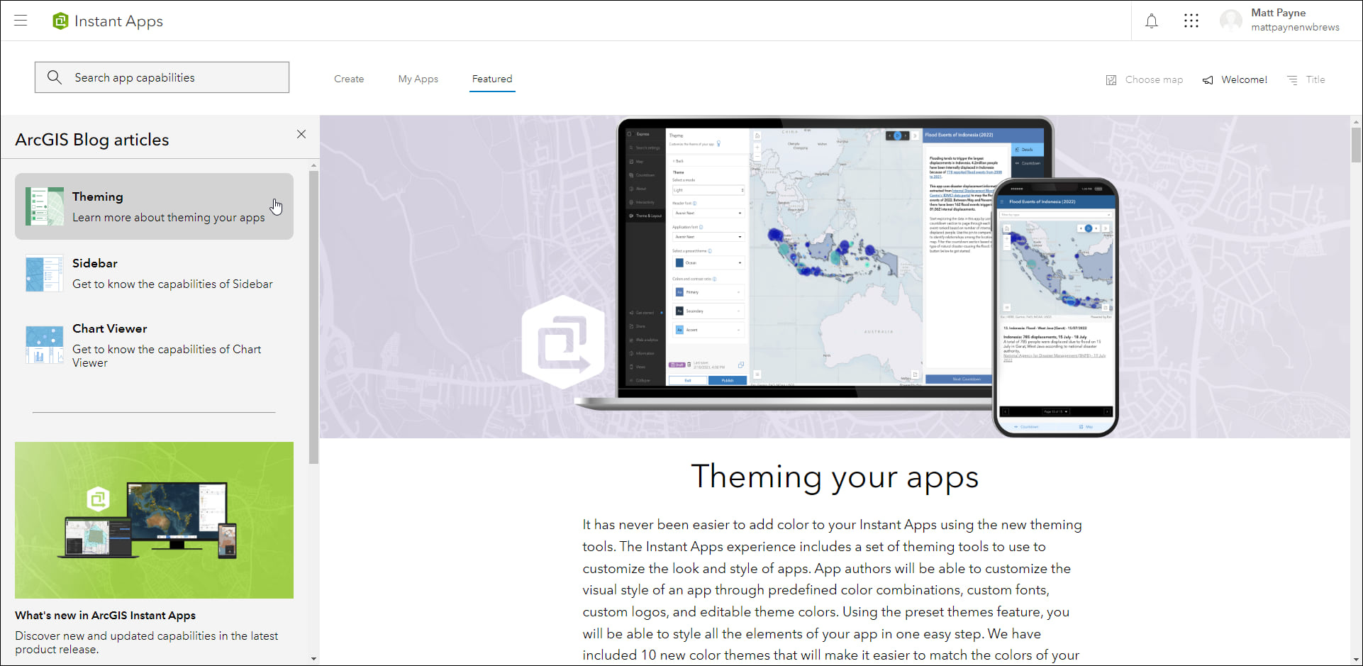 On the Featured tab, the main article of content has been updated with a new topic to discover. Learn about adding color and theming your apps using simple tools inside an app’s configuration. Use the side panel on this tab to reference other featured topics such as Sidebar and Chart Viewer.
