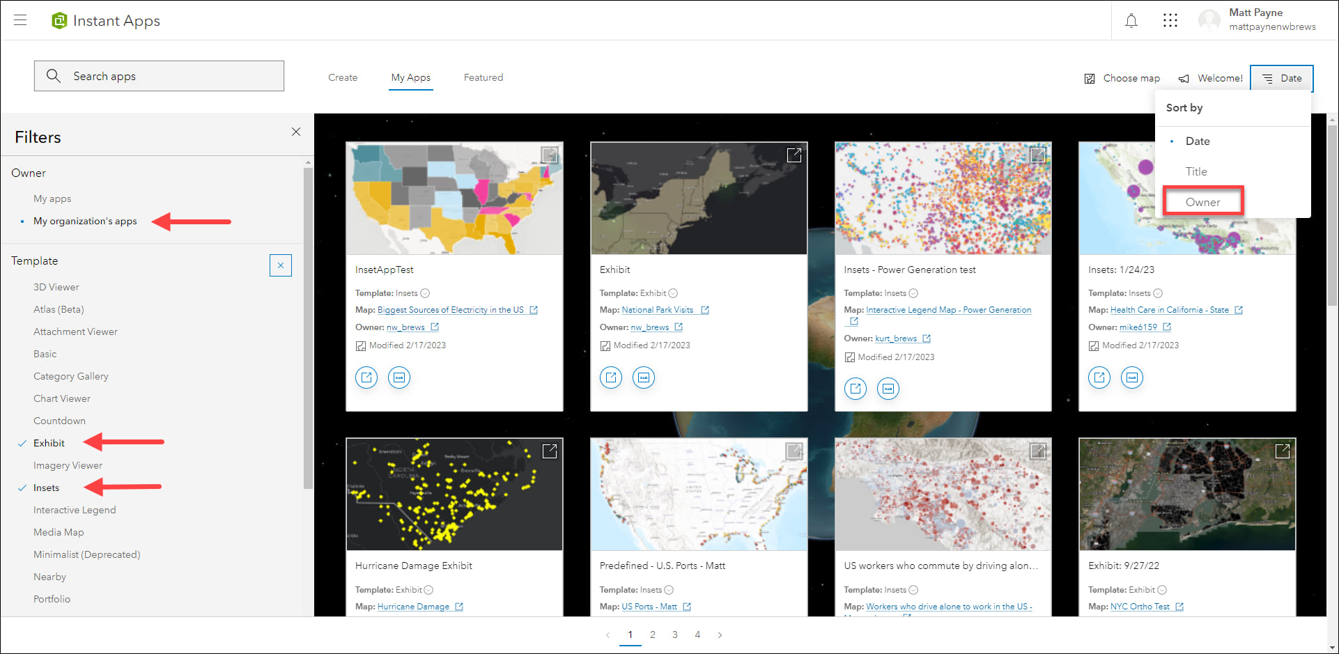 On the My Apps tab, use the Filters pane to filter yours and your organization’s existing apps by app template type and sharing status. When viewing your organization’s apps, use the sorting option for “Owner” to sort the apps alphabetically by owner name. For example, filter for apps owned by members of your organization using Insets and Exhibit, and then sort by the owner name to quickly find the apps owned by a particular member.