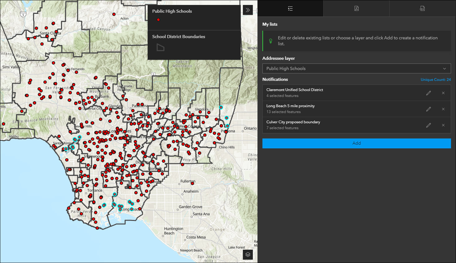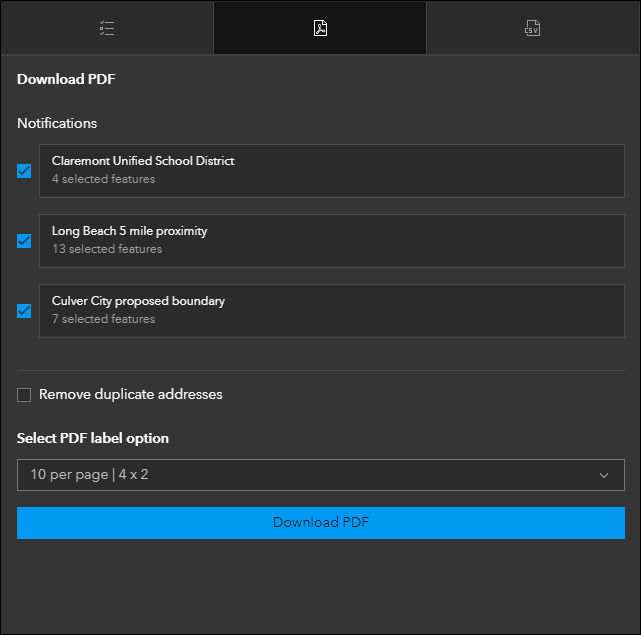 Create a list of features using a map that can be exported to CSV or PDF using Public Notification (Beta). Search for a single location or draw an area of interest using sketch tools to define a set of features. You can also use the geometry of an existing feature or apply a search buffer to expand the resulting features used to create the list. For example, alert locals about road closures due to a weather event by exporting their addresses out as a CSV file. Or, print a PDF list of public high schools contained in a proposed school district rezoning plan. The side panel in the app has tabs for executing each task. Create and edit your lists on the My lists tab and then manage and generate PDFs or CSVs using their respective tabs.