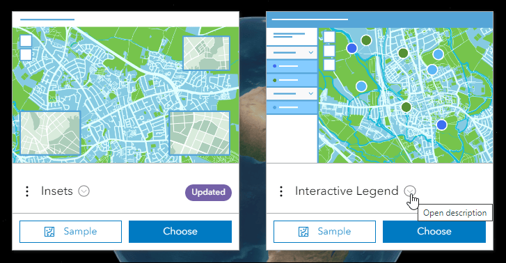 The Instant Apps home page offers a centralized place to browse, choose, create, and manage ArcGIS Instant Apps. On the Create tab, we have added links to view live example apps that let’s you see an app in action using a template you’re interested in. In Gallery view, click the down arrow icon next to any template name to view its App description.