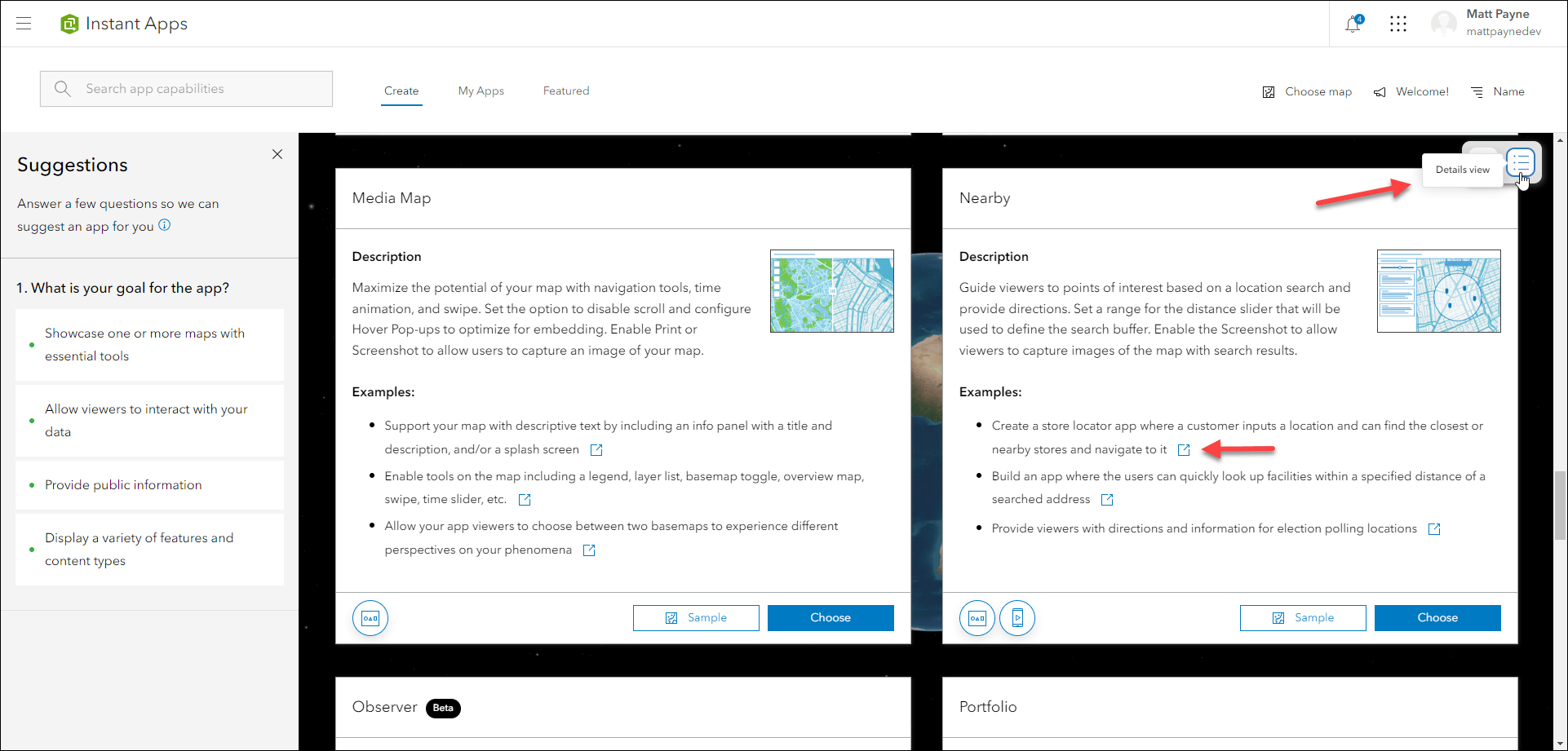 Another way to access these on the Create tab is within Details view. The app description and examples are already shown by default in this view and the new live app hyperlinks for each template are as well.