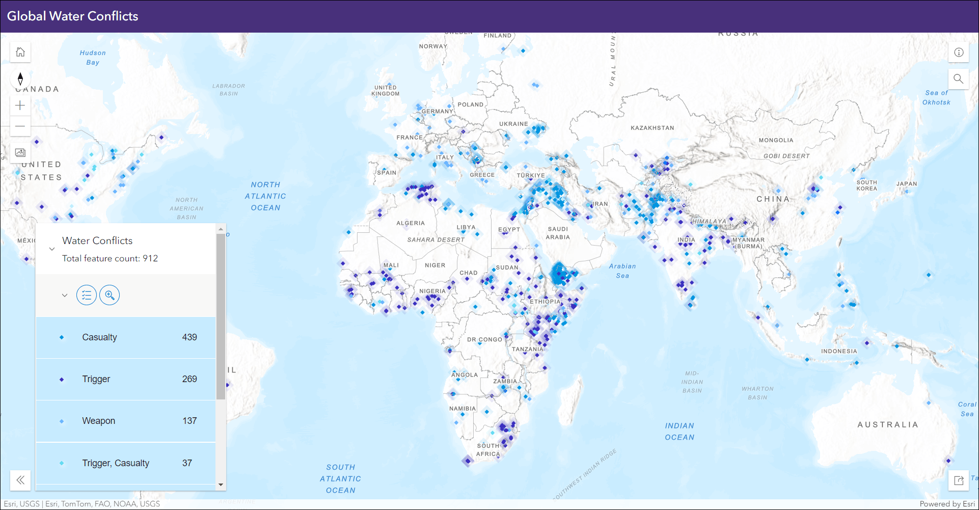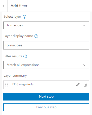 Animate through temporal or numeric data using Slider. We’ve added the ability to create attribute filters to further narrow down features that are displayed in the map and when using the slider. On the Interactivity > Modify section of the app configuration, enable the “Attribute filter” setting then use the + Add filter button to create filters on any supported layers from your map. For example, in an app showing historical tornadoes in the US since 1950 that plays along the slider through decades of occurrence, you can set up an attribute filter that only shows the EF-3 magnitude events. Set up the filter to be “User input” and that way the app viewer can interact by choosing which magnitude of tornadoes they want to view through the decades.
