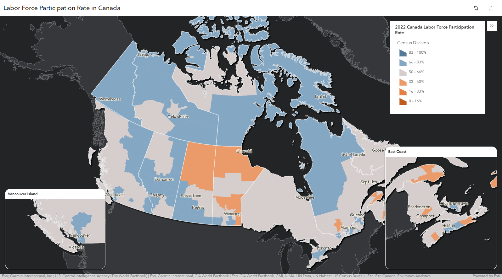 Display noncontiguous geographies and interact with data at multiple locations in a single app using Insets. Pick from a list of predefined geographic layouts or customize the inset locations with the option to use bookmarks from the map. We have added six new predefined layouts that cover the countries of Canada, Ireland, and The Netherlands, with more on the way. Find these new layouts in the Predefined section of the app configuration.