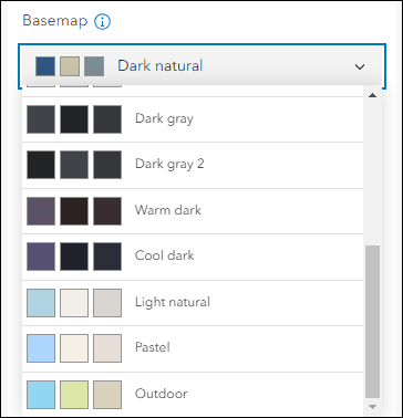 When building an app using one of our many predefined layout options, app creators can now choose from a list of new basemap choices to be displayed in the app. Use the Basemap drop-down in the app configuration to choose from any of the 15 newly released color options.