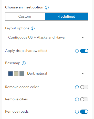 Also new is the option to remove the ocean color from the basemap. Apply this setting to give emphasis to the land and certain thematic layers you might have in your map. Furthermore, we have added settings to remove the cities and the roads (US layouts only) from the basemap. This is part of an ongoing effort to continue providing more control for app creators over how your maps look when using predefined layouts in Insets.