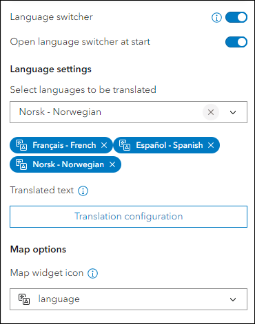 The new Language switcher setting in the app configuration let’s you publish a multilingual app that combines your translated custom text and the UI translations for supported languages. Use the options available on the Language Switcher tab in the configuration to choose which additional languages you want to include, which specific texts will be translated and what those translations are, and what icon will be used in the published app for app viewers. We are in the process of adding the language switcher to all of our apps. For an up to date list of which apps currently support it, please reference our ArcGIS Instant Apps Capability Matrix.