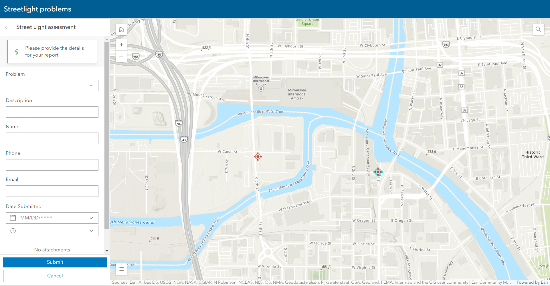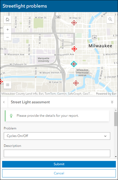 View and submit issues or observations in an area using the new Reporter (Beta) template. This new app lets users create a report that displays on the map. They can also view existing reports and use basic map exploration tools to navigate the map. For example, create a storm water assessment app that lets the community report problems they see during storms such as clogged drains, overflowing easements, damaged street gutters, etc. Or, create a simple app that quickly let’s the public report problems they see with traffic lights on local roads.