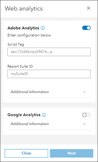 Support for tracking your apps using Adobe Analytics has been added. In the app configuration use the Web analytics button to enable Adobe Analytics and input your Script Tag and Report Suite ID. Customize a unique consent message to inform app users about tracking and seek their consent. The consent message will appear in the app with a button to opt in. Note that the Web Analytics setting requires that your organization is configured to allow sending anonymous usage data. If you do not see the Web Analytics button in the configuration, your administrator can change this in the organization settings.