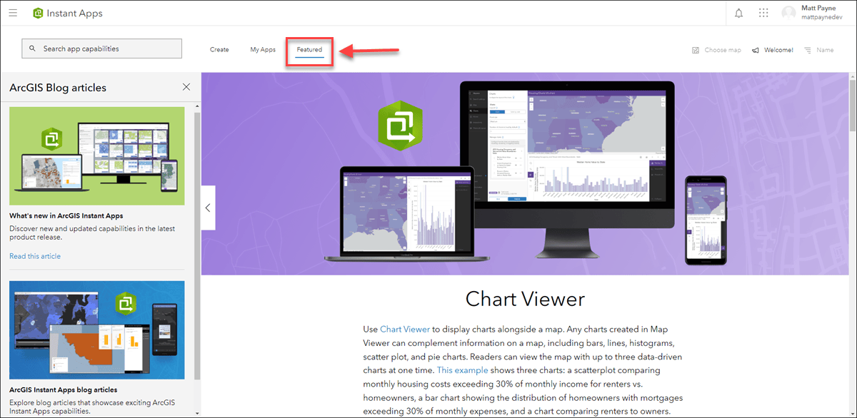 We have also improved and repurposed the Featured tab to include more helpful information and resources about highlighted Instant Apps content, what’s new, and a collection of all Instant Apps blog articles. The main stage window of the Featured tab showcases an individual app or feature, and will update with each release to highlight different exciting content. For this release we are featuring Chart Viewer, which leverages charts authored in Map Viewer to display data-based graphics alongside your map.