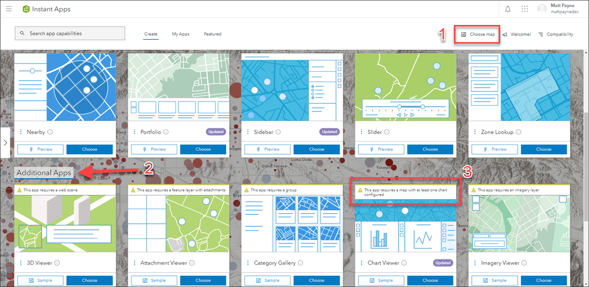 The Instant Apps home page offers a centralized place to browse, choose, create, and manage ArcGIS Instant Apps. This release we have added the ability to choose or change the web map used to initialize creating an app directly in the home page. This option is found on the top right of the header called Choose map (1 in image below). If you access the Instant Apps home page from places such as the Map Viewer or the item page of a web map, your map is recognized and used in the home page to help filter app choices based on compatibility criteria in your map. Apps that are compatible with your map will filter to the top on the Create tab, apps that are not compatible will filter below under the Additional Apps section (2 in image below) each with a message explaining the reason for incompatibility (3 in image below). Use the Choose map option to choose a map for the first time or change the map you entered the home page with. This is handy if you want to create an app that your currently selected map is incompatible with.