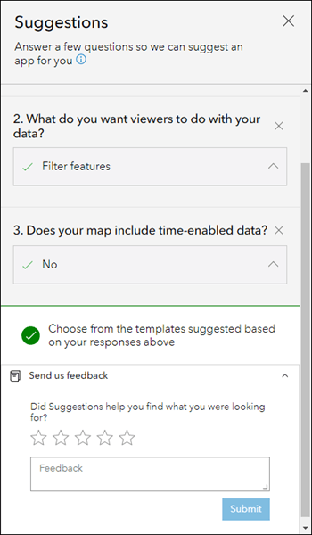 In the March release we added a new way to help you choose which Instant App to use based on your data, purpose, and workflow. On the Create tab, use the Suggestions side panel to answer a few questions to see filtered down app choices based on the answers you provide. It begins with a more broad question asking about the general goal for your app, and then narrows down based on your responses. Suggestions are intended to help guide you to a more refined set of app choices. Try out this feature and if you have any feedback about the question and answer choices, or about the experience as a whole, we would love to hear how we can improve. Provide any feedback you have on how we can help you choose the right Instant App by using the new Send us feedback option that appears at the bottom of the side panel after you have answered the last question.