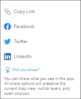 In March we improved and refreshed the sharing menu that includes social sharing options and the ability to generate a link. All sharing options preserve the current map view, layer visibility, and open popups. Use this option to share what you see in the app. With the June update, we have added this new share tool to all of our apps. To include it in your app, enable the Social sharing option in the app configuration.