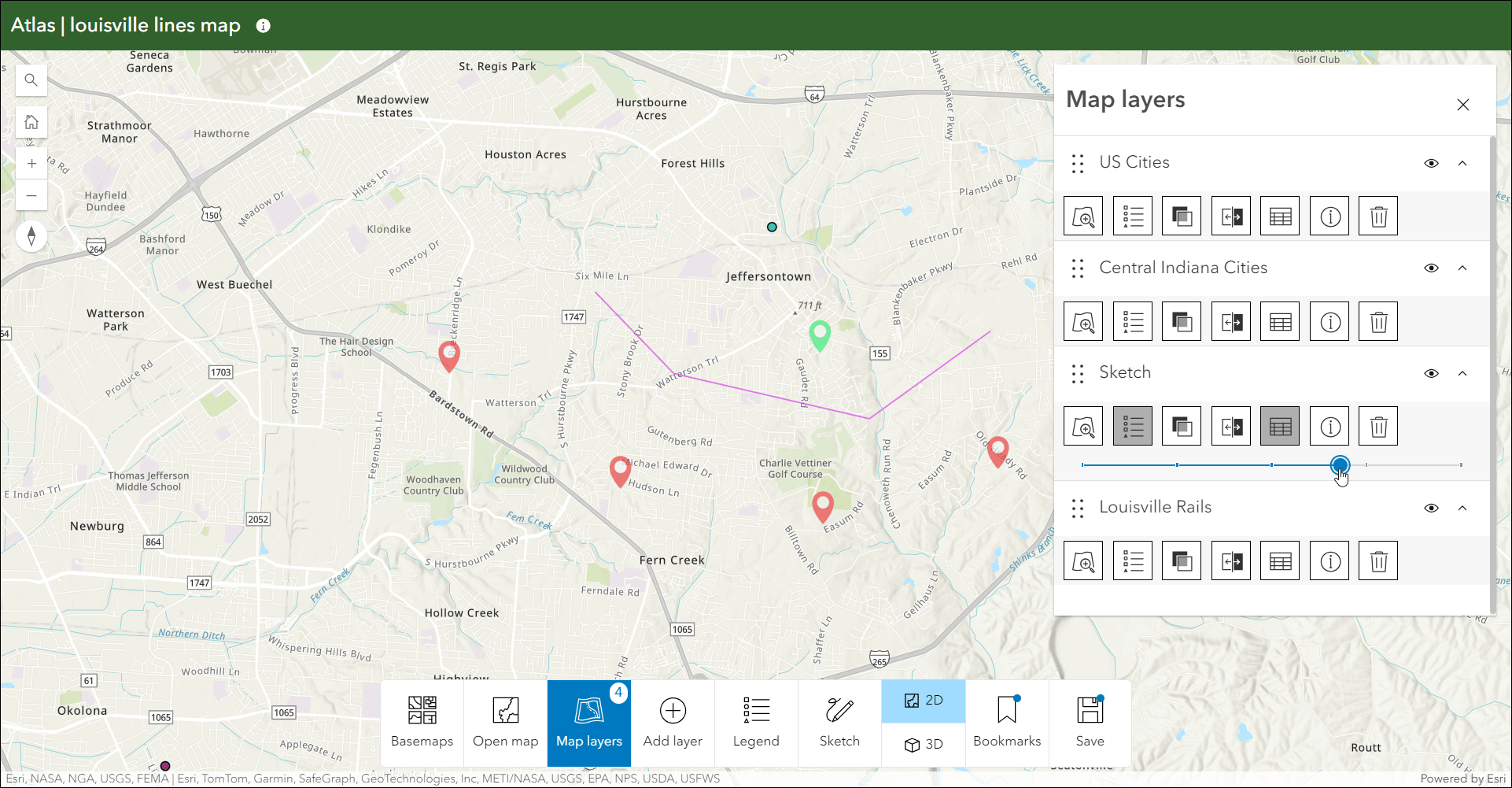 Now when you create sketches you can access and modify them in the Map layers panel. When you create a sketch it will appear as a layer in the Map layers panel and include helpful options such as swipe, layer transparency, and more.